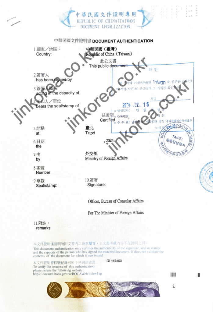 - 대만에서 두가지 서류 발급 후, “(1) 대만 외교부 공증” + “(2) 주타이베이한국대표부 인증”이 꼭 필요하다.