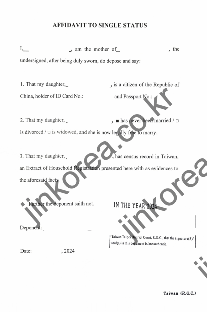 대만은 “미혼증명서”라는 정부 발급 서류가 존재하지 않아서 “호적등본(戶籍謄本)” + “단신선서서(單身宣誓書)” 조합으로 “미혼증명서”를 대신한다. 즉, 단신선서서로 혼인이 가능한 상태라는 것을 선서하고, 호적등본으로 해당 선서의 주체가 정말 대만 시민권자로서 존재하는 사람인지를 확인하는 것이다.